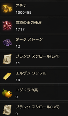 経験値が0.1169%、アデナが1M、イベントアイテムの残滓が1,717個、TOI血痕が5個出ています。