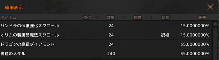 イベント中はパンドラ保護スクを複数枚使った確率強化ができて、失敗すると輝く装身具の珠がもらえます。